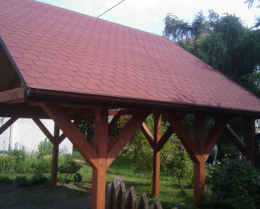 Konstrukcja dachu podparta na słupach drewnianych. Pokrycie leży na poszyciu z płyt OSB.