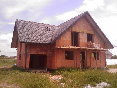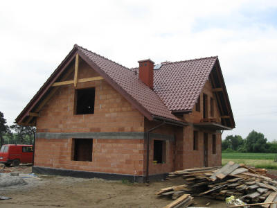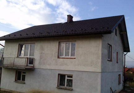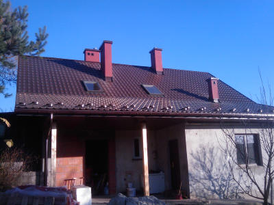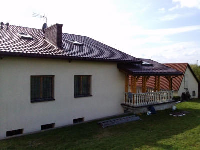 Wymiana pokrycia dachowego oraz rynien, przemurowanie kominów, docieplenie poddasza, wykonanie podbicia dachowego.